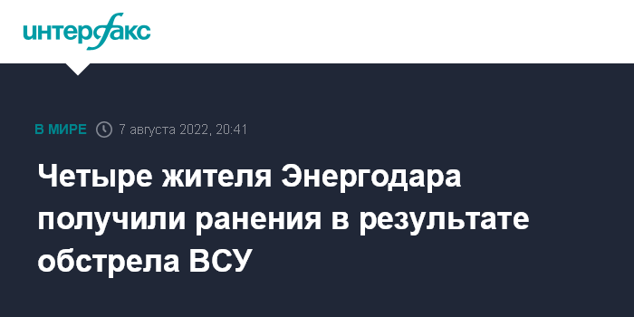 Москва. 7 августа. INTERFAX.RU - Вооруженные силы Украины обстреляли садовое товарищество на окраине Энергодара на подконтрольной РФ части Запорожской области, ранены четыре мирных жителя, сообщили журналистам в пресс-службе администрации города в воскресенье.