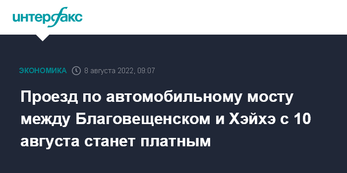 Москва. 8 августа. INTERFAX.RU - Проезд по международному автомобильному мосту через реку Амур между Благовещенском и Хэйхэ с 10 августа станет платным, сообщил Минтранс Амурской области.