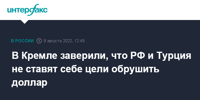 Москва. 8 августа. INTERFAX.RU - В Кремле заявили, что договоренности России и Турции о частичном переходе во взаиморасчетах на национальные валюты не преследуют цель обрушить американскую валюту.