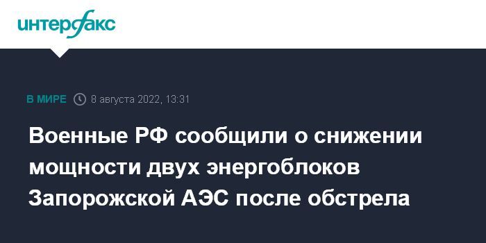 Москва. 8 августа. INTERFAX.RU - Украинские формирования в минувшее воскресенье обстреляли Запорожскую АЭС, для предотвращения нарушения работы атомной электростанции снижена мощность двух энергоблоков, сообщили в Минобороны РФ.