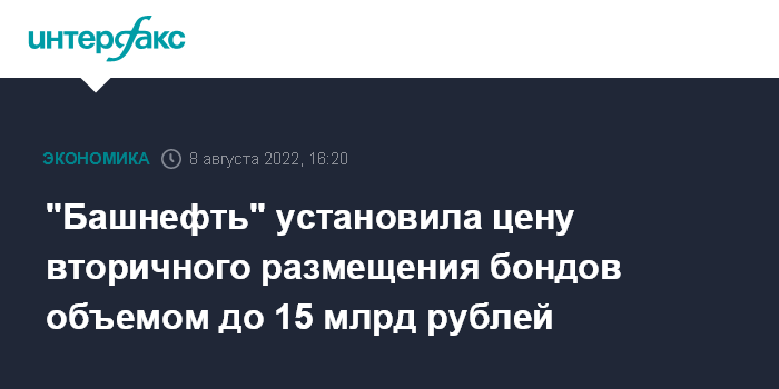 Москва. 8 августа. INTERFAX.RU - ПАО АНК "Башнефть" установило цену вторичного размещения выпуска облигаций 7-й серии объемом до 10 млрд рублей и 9-й серии объемом до 5 млрд рублей на уровне 100% от номинала, сообщил "Интерфаксу" источник на финансовом рынке.