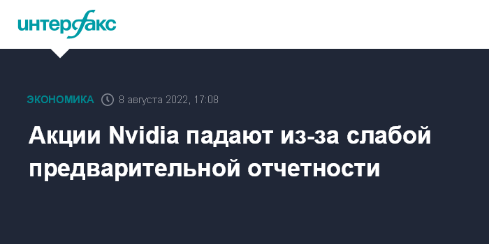 Москва. 8 августа. INTERFAX.RU - Американский производитель графических процессоров Nvidia Corp опубликовал предварительную отчетность за второй финансовый квартал и предупредил о списаниях в связи с нераспроданными запасами, после чего акции компании начали резко дешеветь.