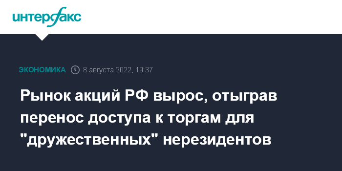 Москва. 8 августа. INTERFAX.RU - Рынок акций РФ по итогам торгов понедельника вырос на 1-1,7%, отыграв сообщение "Московской биржи" о переносе доступа к торгам акциями для "дружественных" нерезидентов. Пик повышения пришелся на первый час торгов, когда рост основных фондовых индикаторов превышал 3%, после чего рынок успокоился и лег в боковой дрейф под отметкой 2100 пунктов по индексу МосБиржи.