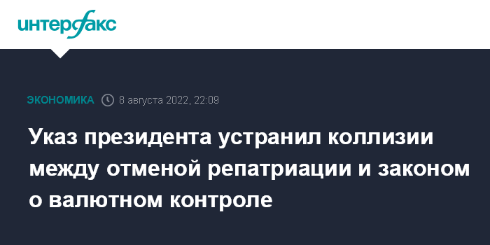 Москва. 8 августа. INTERFAX.RU - Указ президента "О временном порядке исполнения обязательств по договорам банковского счета (вклада), выраженных в иностранной валюте, и обязательств по облигациям, выпущенным иностранными организациями" устранил коллизию, возникшую между указом главы государства, ранее фактически отменившим обязательную репатриацию, и требованиями закона "О валютном регулировании и валютном контроле".