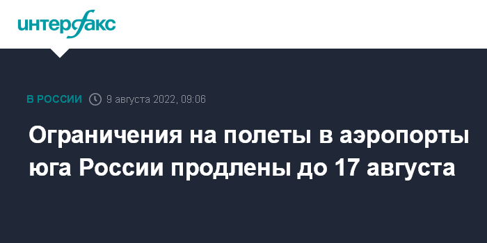 Москва. 9 августа. INTERFAX.RU - Росавиация продлила до 17 августа запрет на полеты в аэропорты центральной части и юга России.