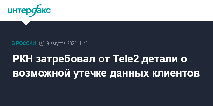 Москва. 9 августа. INTERFAX.RU - Роскомнадзор потребовал от оператора Tele2 подробную информацию о возможной утечке персональных данных клиентов, сообщили "Интерфаксу" в ведомстве.
