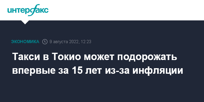 Москва. 9 августа. INTERFAX.RU - Поездки на такси в Токио могут подорожать впервые за последние 15 лет на фоне общего роста цен в стране, сообщает Bloomberg.