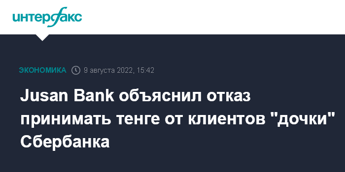 Москва. 9 августа. INTERFAX.RU - Казахстанский Jusan Bank перестал принимать платежи и переводы в тенге от клиентов "дочки" Сбербанка, поскольку структура собственности Jusan обязывает его соблюдать не только законы Казахстана, но и санкционное законодательство США, сообщили "Интерфаксу" в пресс-службе кредитной организации.