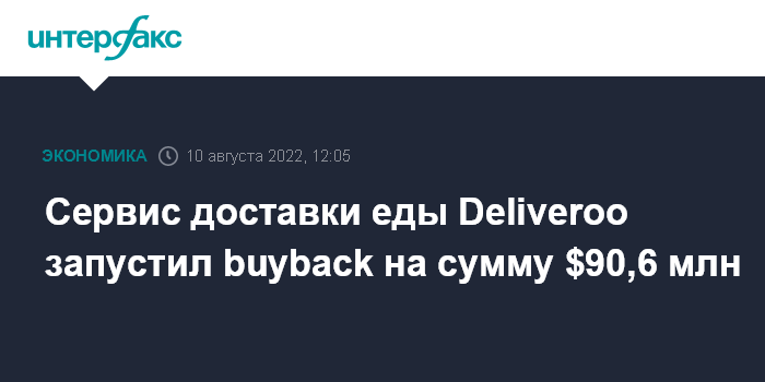 Москва. 10 августа. INTERFAX.RU - Британский сервис доставки еды Deliveroo Plc в первом полугодии 2022 года сообщил, что нарастил доналоговый убыток на 54% на фоне снижения потребительского спроса из-за высокой инфляции. Компания также анонсировала программу обратного выкупа акций объемом 75 млн фунтов ($90,6 млн)