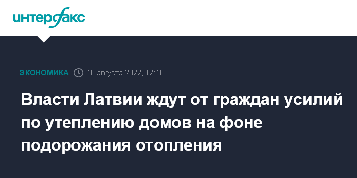 9 августа правительство Латвии одобрило изменения в закон о мерах по уменьшению влияния чрезвычайного роста цен на энергоресурсы, предусматривающие, в том числе, компенсацию затрат домашних хозяйств на теплоснабжение. Общая сумма поддержки увеличивается с первоначально предполагавшихся 350 млн евро до 442,25 млн евро.