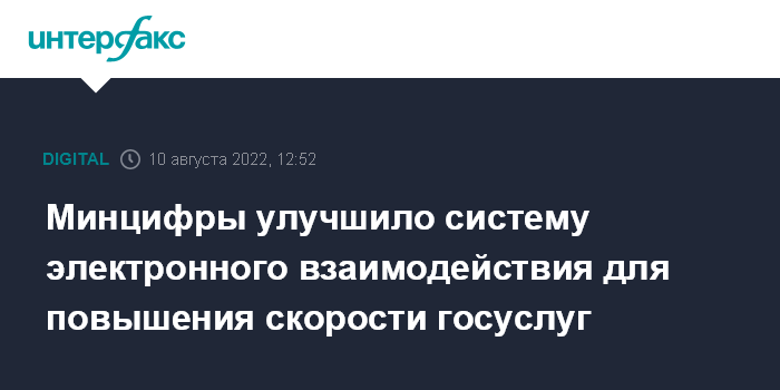 Москва. 10 августа. INTERFAX.RU - Минцифры РФ усовершенствовало систему межведомственного электронного взаимодействия (СМЭВ), благодаря чему повысятся скорость и качество госуслуг, сообщили "Интерфаксу" в пресс-службе ведомства в среду.