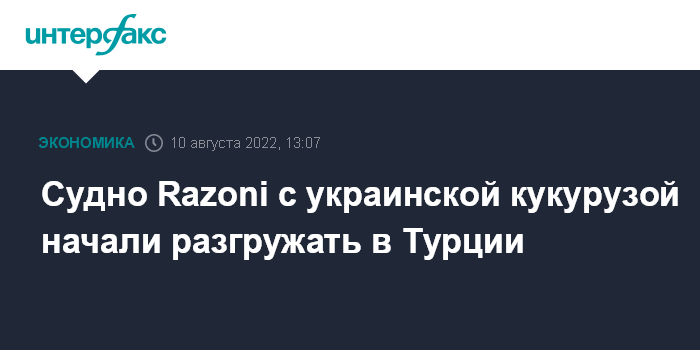 Москва. 10 августа. INTERFAX.RU - Судно Razoni, которое первым вышло из украинского порта после достижения договоренностей о коридорах для безопасного вывоза украинской сельхозпродукции морем, начали разгружать в Турции в Мерсине, сообщила межарабская газета "Аш-Шарк аль-Аусат" со ссылкой на источники.