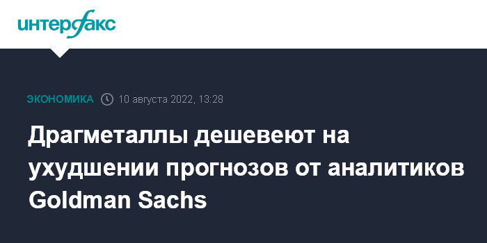 Москва. 10 августа. INTERFAX.RU - Аналитики американского банка Goldman Sachs ухудшили прогнозы о динамике цен на серебро и золото, из-за чего драгоценные металлы начали умеренно дешеветь на торгах 10 августа.