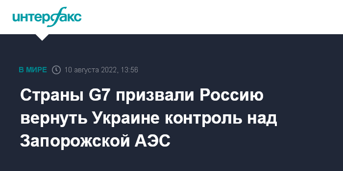 Москва. 10 августа. INTERFAX.RU - Главы МИД стран G7 в среду призвали Россию передать под контроль Украины Запорожскую АЭС.