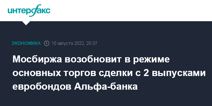 Москва. 10 августа. INTERFAX.RU - "Московская биржа" 11 августа возобновит проведение сделок в режиме основных торгов с двумя выпусками субординированных евробондов Альфа-банка в долларах США ("вечных" и с погашением в 2030 году), следует из информации на сайте торговой площадки.