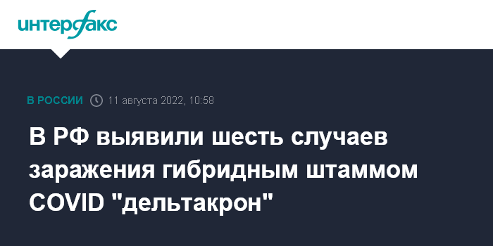 Москва. 11 августа. INTERFAX.RU - В РФ обнаружено шесть случаев заболевания вариантом коронавируса "дельтакрон", который представляет собой гибрид штаммов "дельта" и "омикрон"; оснований считать, что он приводит к более тяжелому течению заболевания или обладает большей способностью передаваться от человека к человеку, нет, сообщили в Роспотребнадзоре.
