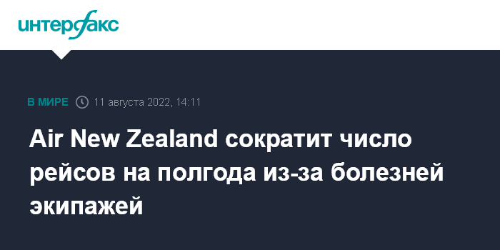 Москва. 11 августа. INTERFAX.RU - Новозеландская авиакомпания Air New Zealand Ltd. сократит количество внутренних и международных рейсов на следующие шесть месяцев на фоне высокого уровня заболеваемости среди персонала из-за распространения коронавируса и гриппа.