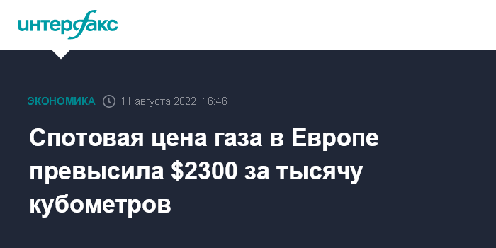 Москва. 11 августа. INTERFAX.RU - Спотовая цена газа в Европе превысила планку $2300 за тысячу кубометров.