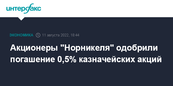 Москва. 11 августа. INTERFAX.RU - Акционеры "Норникеля" на внеочередном собрании одобрили уменьшение уставного капитала путем погашения казначейских акций, сообщила компания.