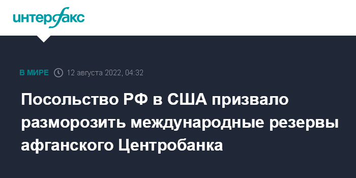 Москва. 12 августа. INTERFAX.RU - Российское посольство в Вашингтоне поддержало опубликованное "Центром исследования экономики и политики" письмо более 70 экономистов из США и других стран с призывом к американским властям разморозить все международные резервы Центрального банка Афганистана.