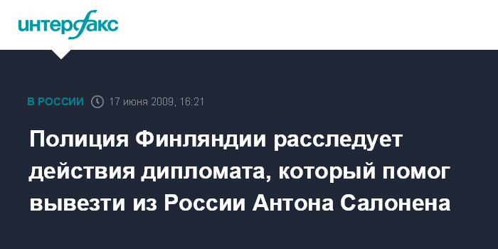 Санкт-Петербург. 17 июня. INTERFAX.RU - Центральная полиция Финляндии проводит расследование действий консула Генерального консульства республики в Петербурге Симо Пиетиляйнена, помогшего вывезти из России мальчика Антона Салонена.