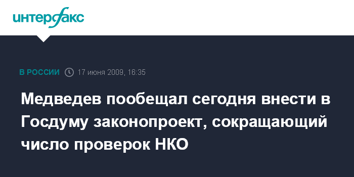 Москва. 17 июня. INTERFAX.RU - Президент РФ Дмитрий Медведев внесет в среду в Госдуму законопроект, сокращающий число проверок некоммерческих организаций до одного раза в три года. На встрече с представителями российских НКО в среду Медведев заявил, что существующий порядок отчетности для таких организаций обременителен, и теперь будет достаточно уведомить государство о том, что организация продолжает свою деятельность.