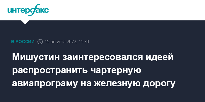 Москва. 12 августа. INTERFAX.RU - Премьер-министр Михаил Мишустин поручит Минтрансу, РЖД и Ростуризму изучить предложение распространить действующую внутреннюю чартерную авиапрограмму на путешествия железнодорожным транспортом.