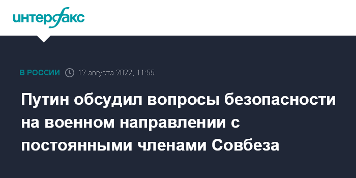 Москва. 12 августа. INTERFAX.RU - Президент РФ Владимир Путин обсудил с постоянными членами Совбеза РФ вопросы обеспечения безопасности на военном направлении.