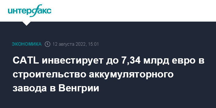 Москва. 12 августа. INTERFAX.RU - Китайская Contemporary Amperex Technology Co. Ltd. (CATL), ведущий производитель аккумуляторов для электромобилей в Китае, планирует построить свой второй завод в Европе.