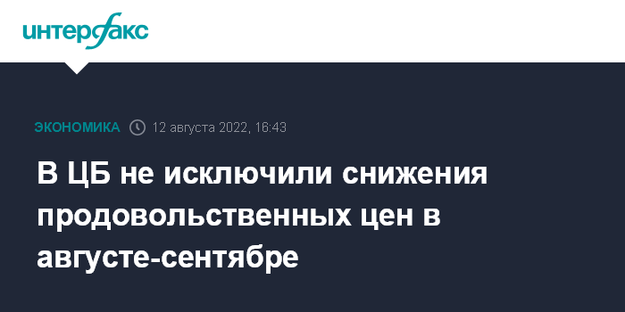 Москва. 12 августа. INTERFAX.RU - ЦБ РФ не исключает снижения индекса продовольственных цен в России в августе-сентябре на фоне благоприятной ситуации с урожаем.