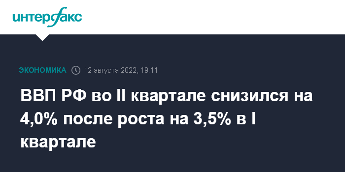 Москва. 12 августа. INTERFAX.RU - ВВП РФ во II квартале 2022 года снизился на 4,0% по сравнению со II кварталом 2021 года. Такую предварительную оценку опубликовал в пятницу Росстат.