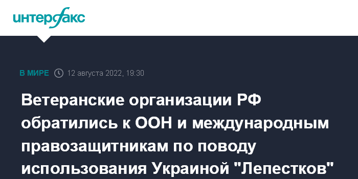 Москва. 12 августа. INTERFAX.RU – Общественные организации "Российский Союз ветеранов Афганистана" (РСВА) и "Боевое братство" обратились в Организацию Объединенных Наций и международные правозащитные организации с просьбой пресечь использование Вооруженными силами Украины противопехотных мин ПМФ-1 "Лепесток", распространение которых приводит к жертвам среди мирного населения на Донбассе, говорится сообщениях, в распространенных в пятницу пресс-службами ветеранских объединений.