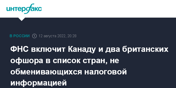 Москва. 12 августа. INTERFAX.RU - Федеральная налоговая служба (ФНС) намерена включить с 1 января 2023 года в обновленный перечень государств и территорий, не обеспечивающих обмен информацией для целей налогообложения с РФ, Канаду и два офшора Великобритании - Каймановы острова и остров Мэн.