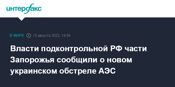 Москва. 13 августа. INTERFAX.RU - В военно-гражданской администрации Запорожской области в субботу заявили об обстреле Энергодара и Запорожской атомной электростанции (ЗАЭС).