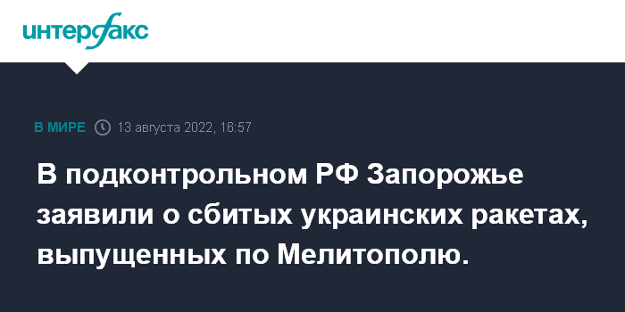 Москва. 13 августа. INTERFAX.RU - В военно-гражданской администрации Запорожской области сообщили о сбитых системой противовоздушной обороны ракетах, которые были выпущены с украинской стороны по Мелитополю.