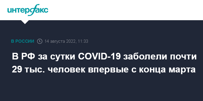 Москва. 14 августа. INTERFAX.RU - Суточный прирост новых заболевших коронавирусной инфекцией в РФ впервые с конца марта составил почти 29 тыс. случаев, следует из данных оперативного штаба, обнародованных в воскресенье.