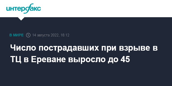 Ереван. 14 августа. ИНТЕРФАКС - Один человек погиб, 45 получили ранения в результате взрыва в воскресенье в ереванском торговом центре "Сурмалу", специализирующемся на оптовой продаже различных товаров и продуктов, сообщили в МЧС Армении.