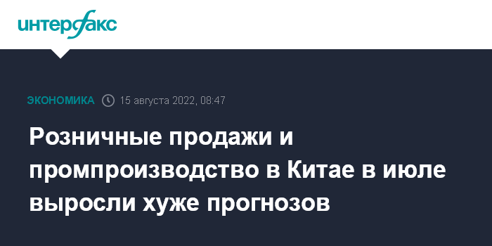 Москва. 15 августа. INTERFAX.RU - В Китае в июле розничные продажи и объем промышленного производства выросли хуже прогнозов аналитиков на фоне шаткого восстановления китайской экономики после пандемии из-за сохранения политики нулевой терпимости к COVID-19.