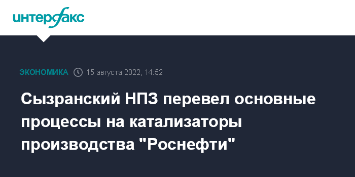 Москва. 15 августа. INTERFAX.RU - АО "Сызранский НПЗ" (Самарская область, входит в НК "Роснефть") в рамках корпоративной программы по импортозамещению перевело основные процессы на катализаторы производства "Роснефти".