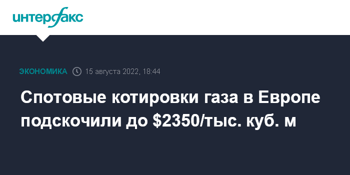Москва. 15 августа. INTERFAX.RU - Стоимость ближайшего (сентябрьского) фьючерса на TTF на бирже ICE Futures вечером в понедельник резко выросла, достигнув $2350 за тысячу кубометров.