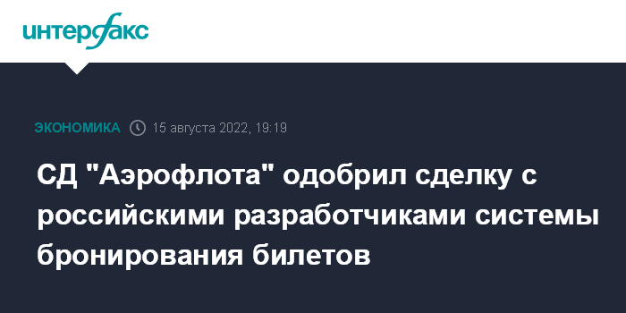 Москва. 15 августа. INTERFAX.RU - Совет директоров "Аэрофлота" одобрил сделку с разработчиками отечественной автоматизированной информационной системы оформления воздушных перевозок (АИС ОВП).