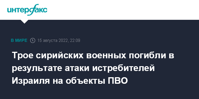 Москва. 15 августа. INTERFAX.RU - Объекты инфраструктуры и ПВО Сирии подверглись ракетному удару со стороны израильской авиации, среди сирийских военных есть жертвы.