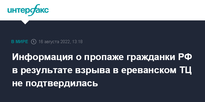 Москва. 16 августа. INTERFAX.RU - Информация о пропавшей без вести гражданке России в ереванском торговом центре "Сурмалу", где в воскресенье произошел взрыв, не подтвердилась, сообщило посольство РФ в Армении во вторник.