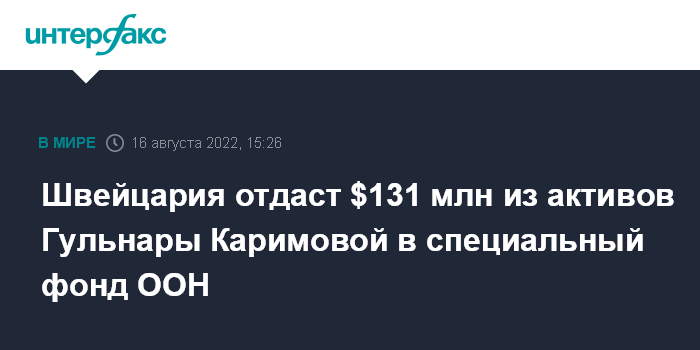 Москва. 16 августа. INTERFAX.RU - Швейцария направит $131 млн из активов Гульнары Каримовой в специально созданный многосторонний трастовый фонд ООН, сообщила во вторник пресс-служба министерства юстиции Узбекистана.