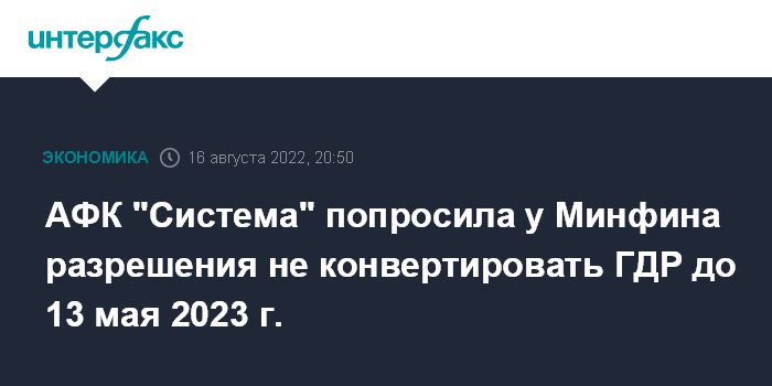 Москва. 16 августа. INTERFAX.RU - ПАО АФК "Система" обратилось в Минфин РФ за разрешением не проводить автоматическую конвертацию глобальных депозитарных расписок (ГДР) корпорации до 13 мая 2023 года, сообщила АФК.