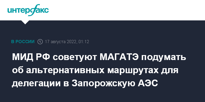 Москва. 17 августа. INTERFAX.RU - Организация поездки делегации МАГАТЭ на Запорожскую АЭС через альтернативные маршруты будет предметом дальнейших переговоров, заявил замдиректора Департамента по вопросам нераспространения и контроля над вооружениями МИД РФ Игорь Вишневецкий.
