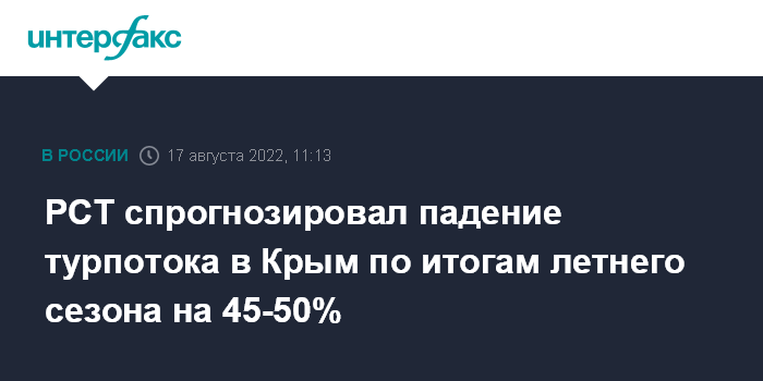 Москва. 17 августа. INTERFAX.RU - Туроператоры по итогам летнего сезона 2022 года прогнозируют снижение турпотока в Крым на 45-50%, это связано с отсутствием авиасообщения, недостатком билетов на поезда и другими логистическими неудобствами, сообщила "Интерфаксу" в среду пресс-секретарь Российского союза туриндустрии (РСТ) Ирина Тюрина.