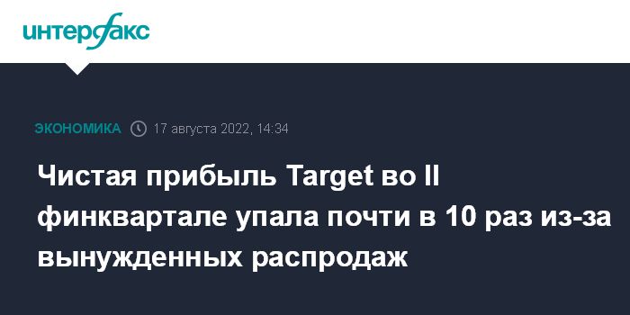 Москва. 17 августа. INTERFAX.RU - Target Corp, владеющая второй по величине в США сетью дисконтных магазинов, зафиксировала почти десятикратное снижение чистой прибыли во втором финансовом квартале из-за вынужденной уценки товаров, сказавшейся на рентабельности ее операций.