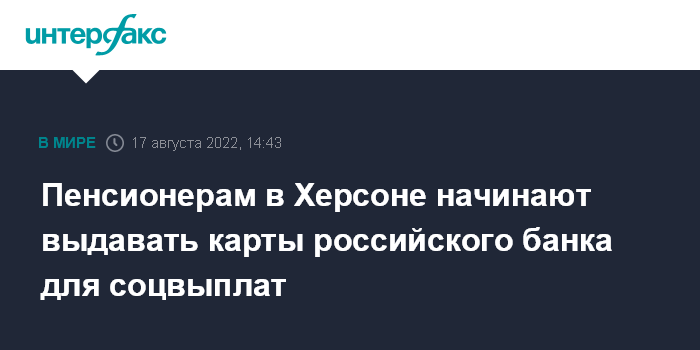 Москва. 17 августа. INTERFAX.RU - Карты российского банка начинают выдавать пенсионерам в Херсоне для начисления пенсий и социальных пособий, сообщила заместитель главы временной администрации Херсонской области Екатерина Губарева.