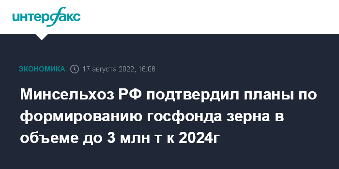Москва. 17 августа. INTERFAX.RU - Минсельхоз РФ подтвердил планы по формированию государственного интервенционного фонда зерна в объеме до 3 млн тонн к 2024 году с помощью закупочных интервенций.